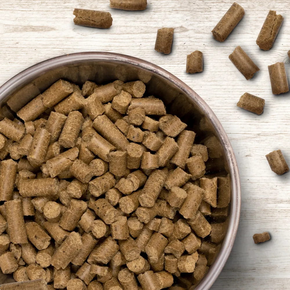 Suszone a następnie mielone mięso wołowe (30%), płatki ziemniaczane, śledź (suszony i mielony 10%), olej rzepakowy tłoczony na zimno (5%), ryż z kiełków, pulpa buraczana, suszone wodorosty, gruszki suszone, jabłka suszone, okrzemki, borówki, suszony tymianek, rozmaryn, koper suszony, rzeżucha suszona, cykoria suszona, glinka lecznicza, juka Schidigera, suszona i mielona, centuria (0,01%).